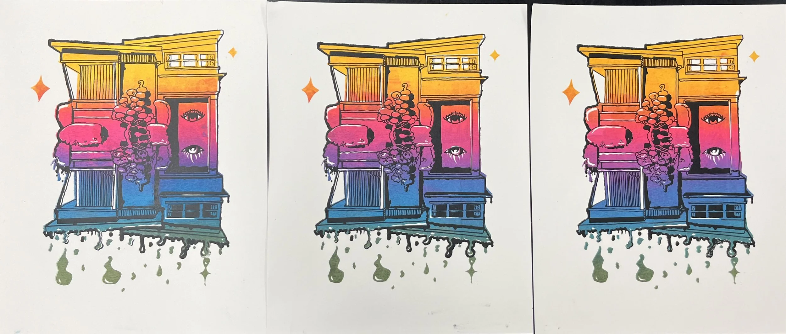 The first layer is a gradient of yellow, pink, blue, and green. All colors have a bit of gold ink mixed in to represent the phrase, “all that glitters isn’t gold”. Each print is slightly different because of the gradient. I like this because it gives each piece a unique feeling while still holding onto the cookie-cutter vibe of the suburbs. I wanted the top half to be bright, happy colors and the bottom ‘nightmare’ part to be darker, almost gross colors. The green at the bottom is the leftover ink from the Pepper Oni gradient mixed with lime green and gold to tie it into the other colors.